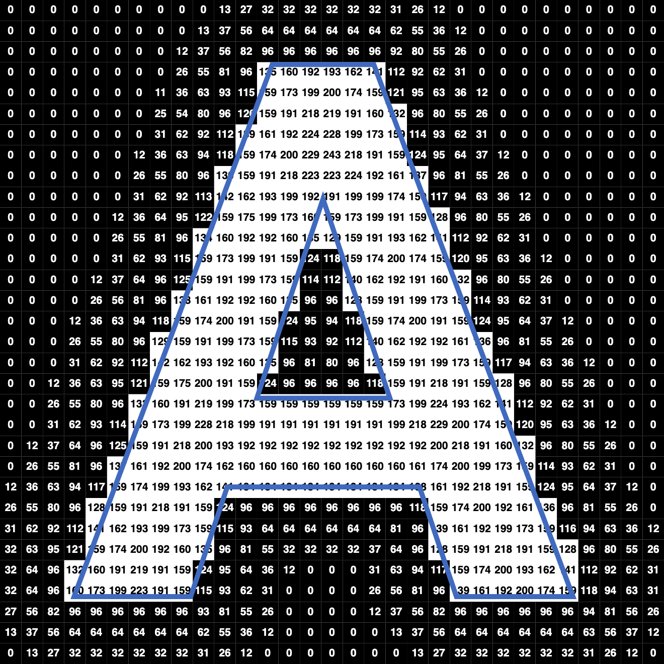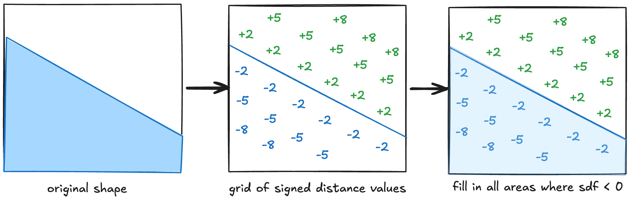 A standalone tool preprocesses vector shapes into raster format, a 2D array of signed distance values. At render time, we read the 2D array and color the pixel based on whether the value is less than zero (inside) or greater than zero (outside):