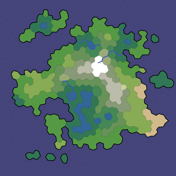 I feel that the noisy edges from this algorithm can be a little too “sharp” but that's something to investigate later. For coastlines and rivers, noisy edges aren't the only option. I also want to look more closely at Scott Turner's blog[3] and Azgaar's blog[4]. For biome boundaries, I want to try noise-based dithering.