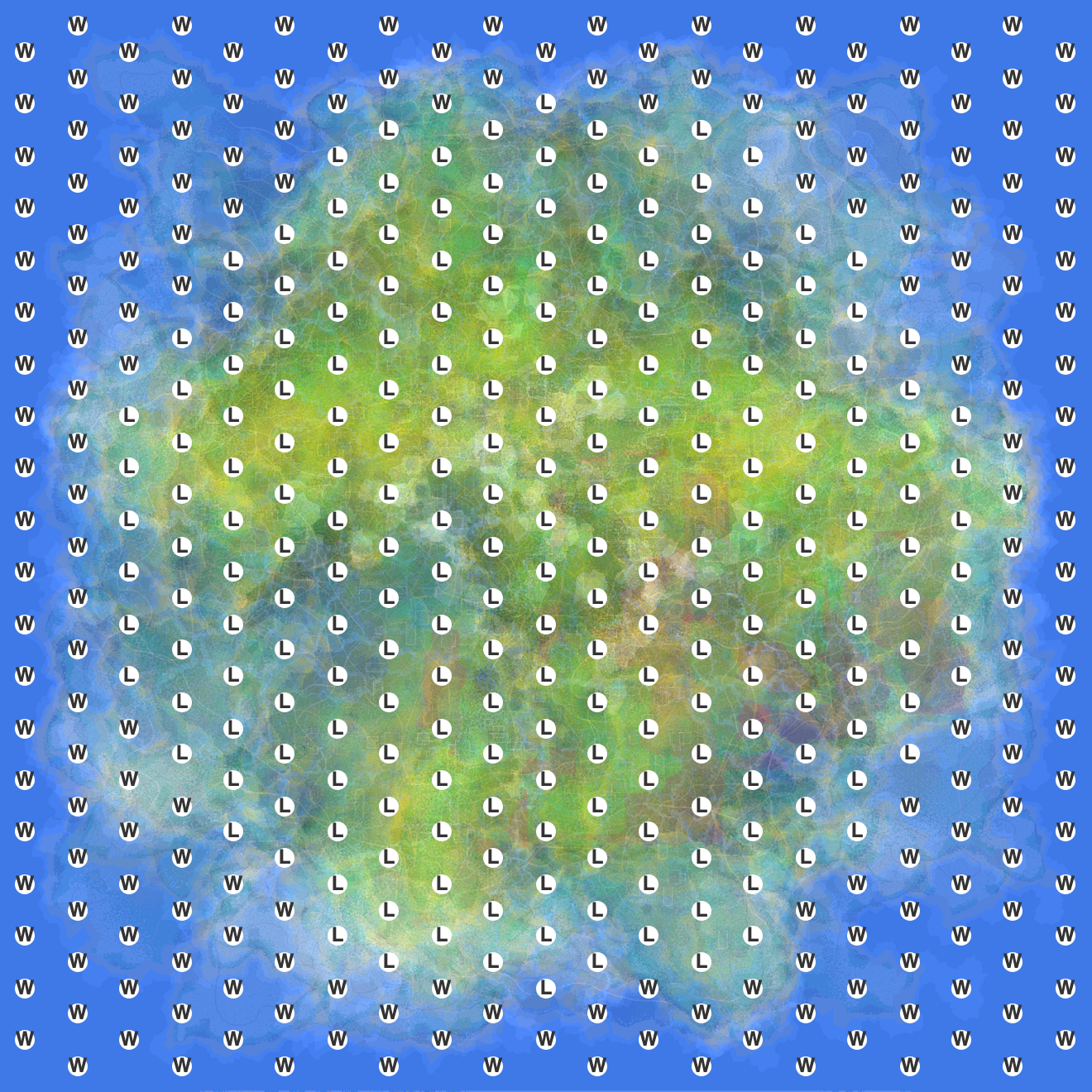 But then I decided I wanted to analyze the points. How often would the average map have Land or Water? The results matched my intuition: